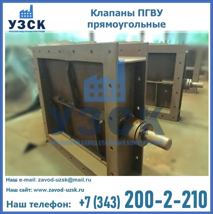 Прямоугольный клапан ПГВУ имеет прямоугольную или квадратную форму, по основному сечению конструкции, на которую устанавливается клапан. Для изготовления шиберов ПГВУ в Иркутске применяются сталь нержавеющая, углеродистая или низколегированная, в зависимости от модели. Внутри клапана имеется запорный элемент, передвигающийся параллельно общему потоку движения среды. Запорный элемент, или створка имеет такую же форму, как и основное сечение. Перемещение створки происходит благодаря возвратно-поступательным движениям.