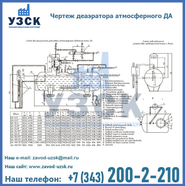 Технические характеристики и размеры атмосферных деаэраторов